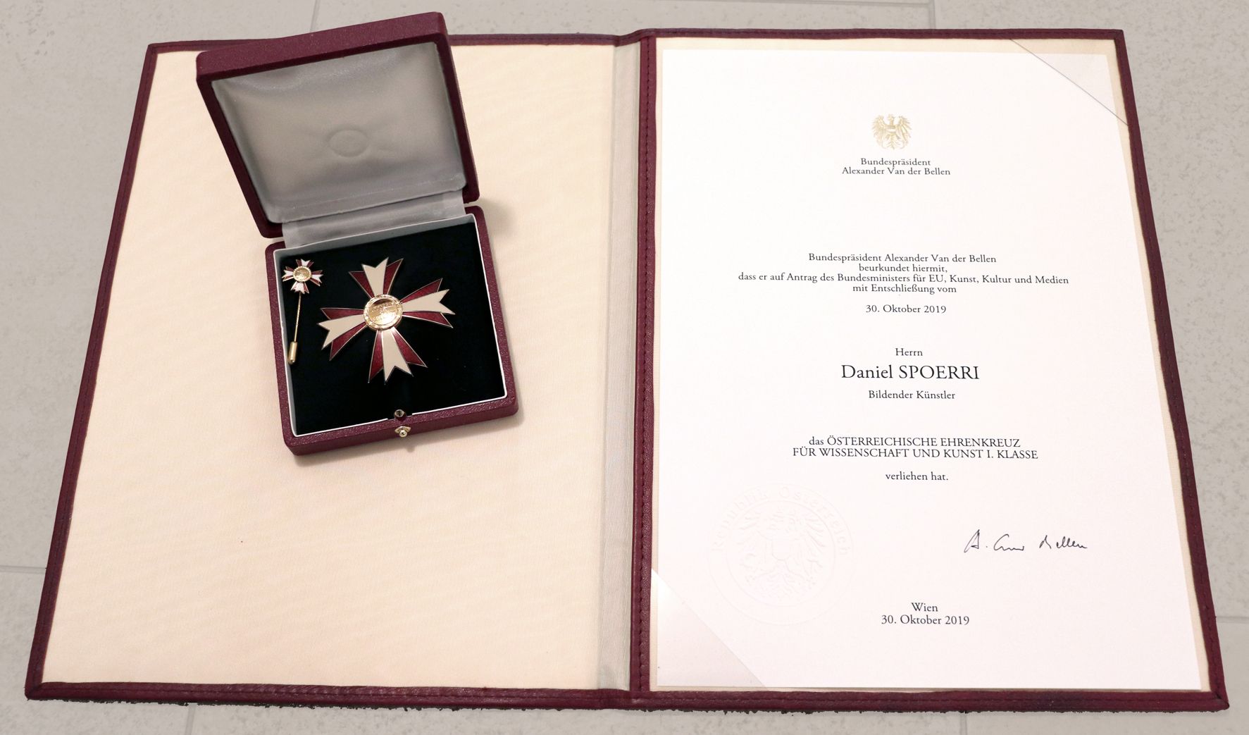 Am 30. September 2020 wurde Daniel Spoerri von Bundespräsident Alexander van der Bellen das Österreichische Ehrenkreuz für Wissenschaft und Kunst 1. Klasse – mit die höchste Auszeichnung, die die Republik für künstlerische oder wissenschaftliche Leistungen zu vergeben hat – in einer sehr intimen Zeremonie in der Präsidentschaftskanzlei in der Wiener Hofburg verliehen.