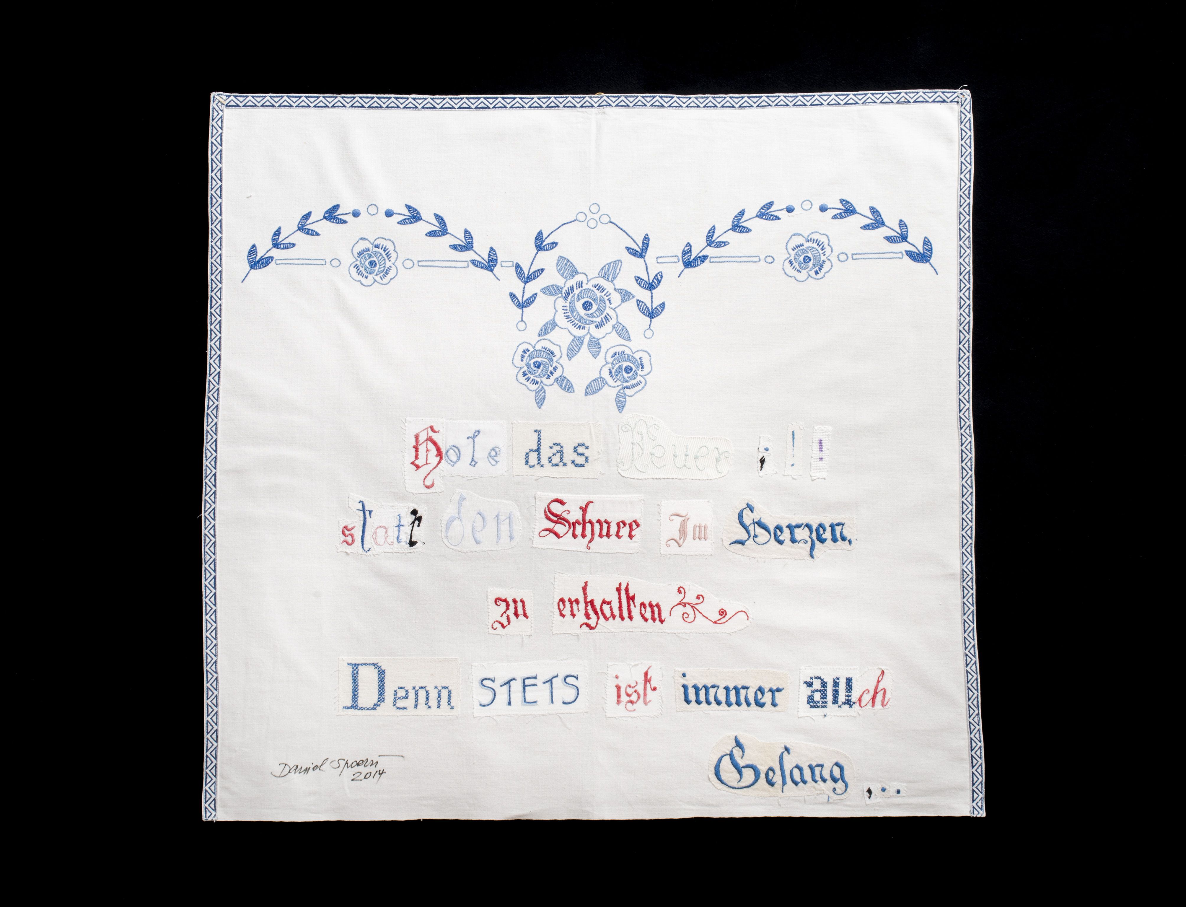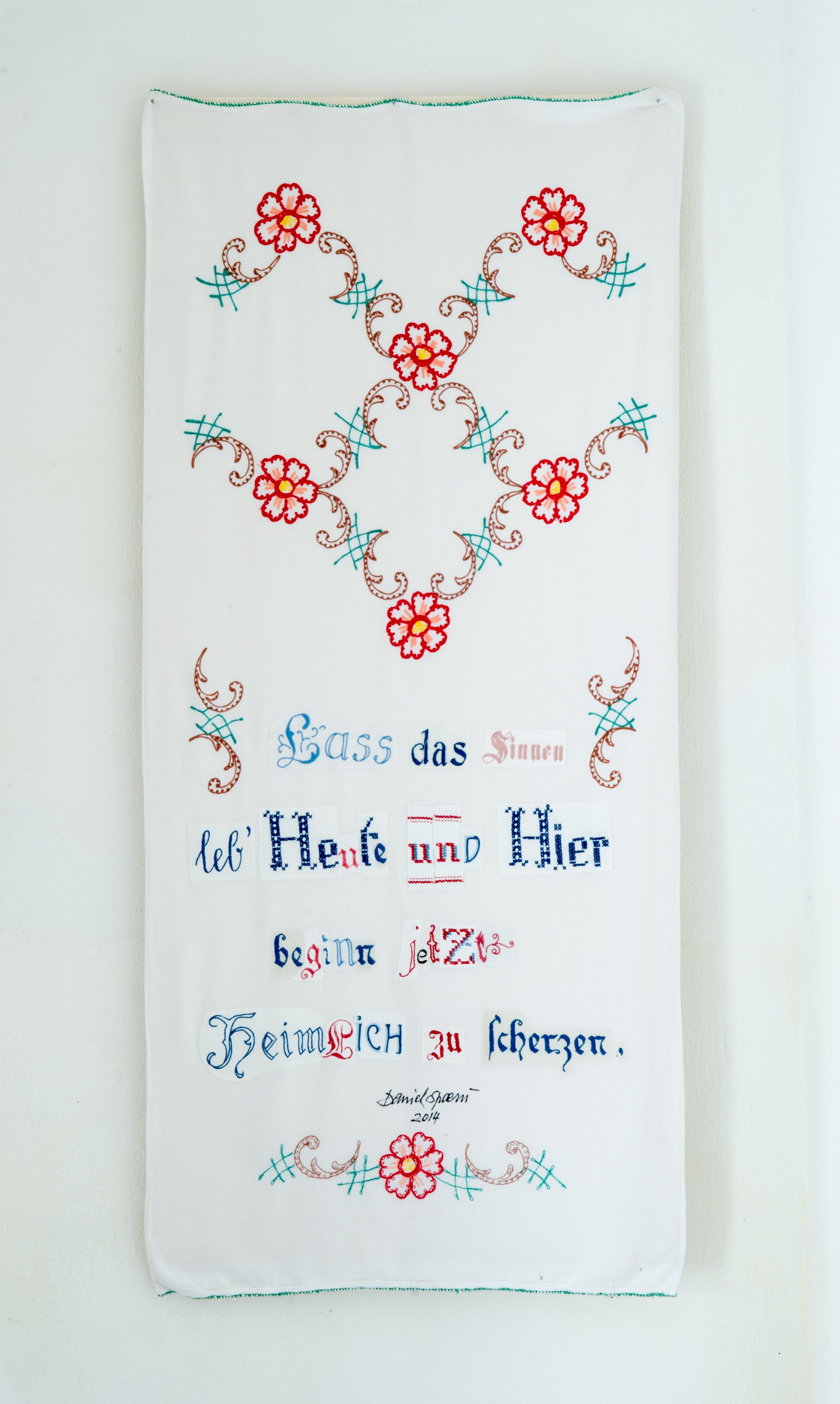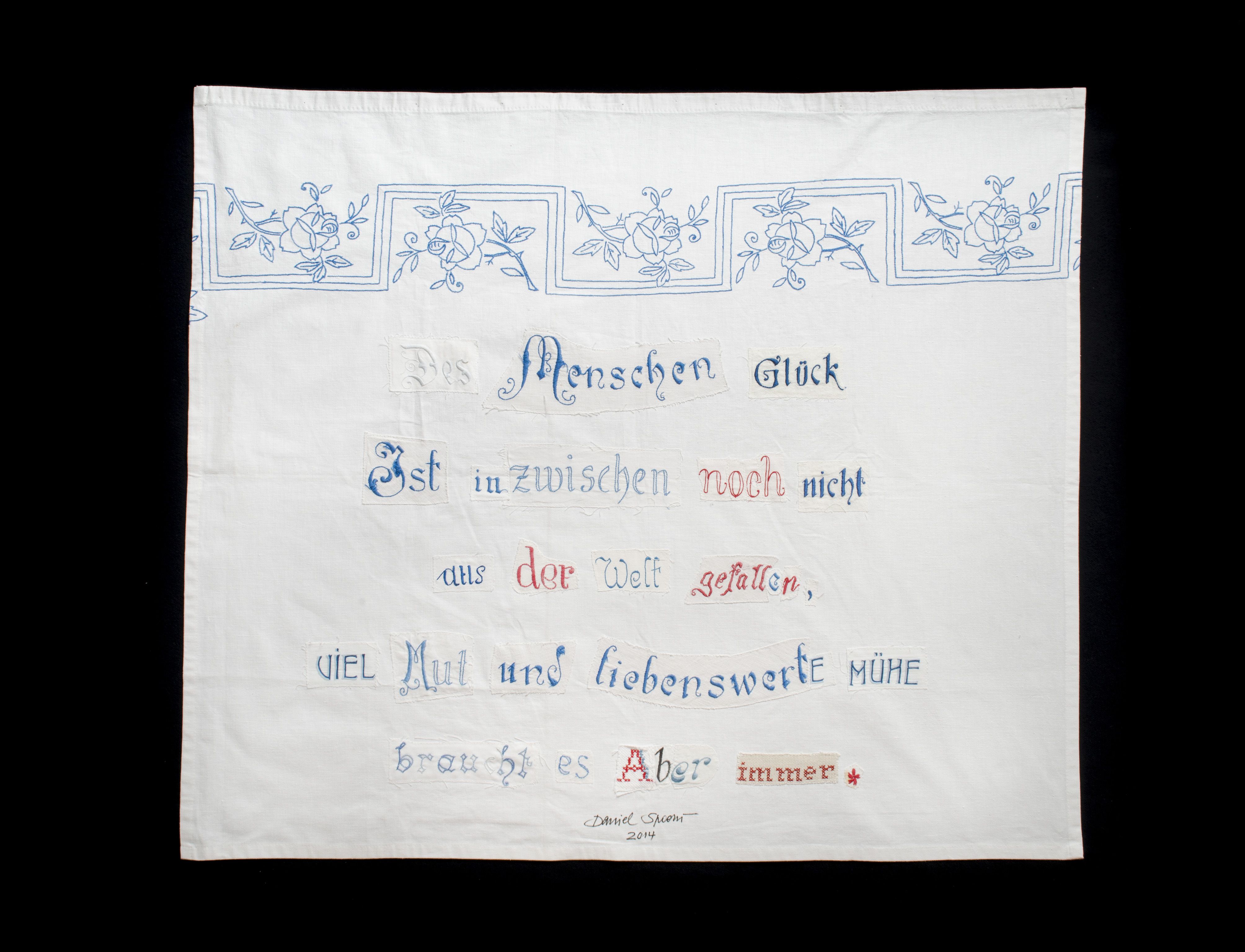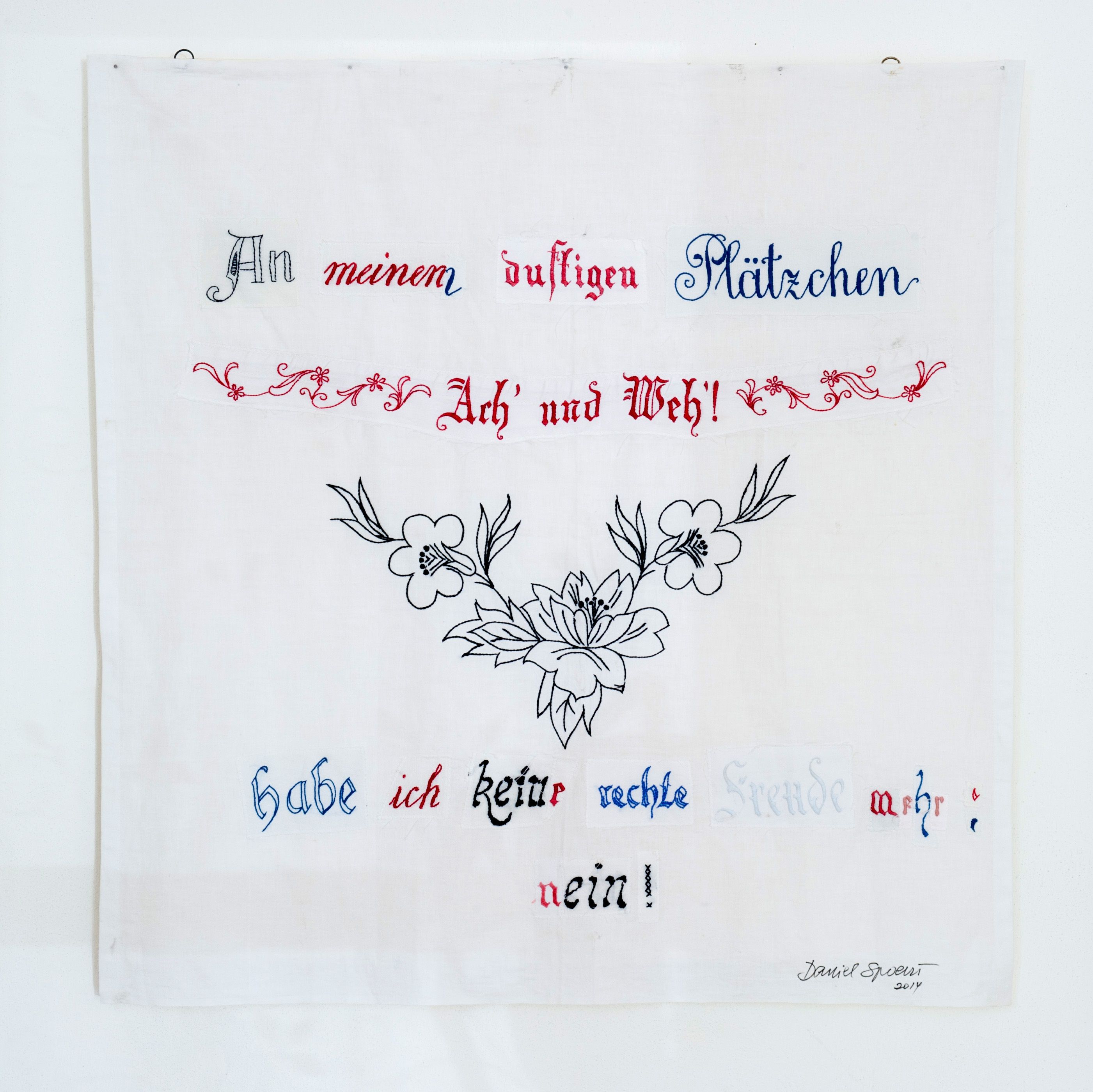 Daniel Spoerri lässt im persönlichen Umgang sehr oft eine fast schon spitzbübische Keckheit durchblitzen. Mit feinem, hintergründigem Witz kommentiert er dann zumeist ganz nebenbei Aussagen oder Situationen. Diesen feinen Witz hat er in seinen Spruchtüchern festgehalten – Kleinodien, zusammengefügt aus Buchstaben und Wörtern von auf dem Flohmarkt gefundenen, mittlerweile aus der Mode gekommenen Tüchern mit gestickten Sinnsprüchen, die früher hinter Sofas zum Schutz der Wand aufgehängt waren.