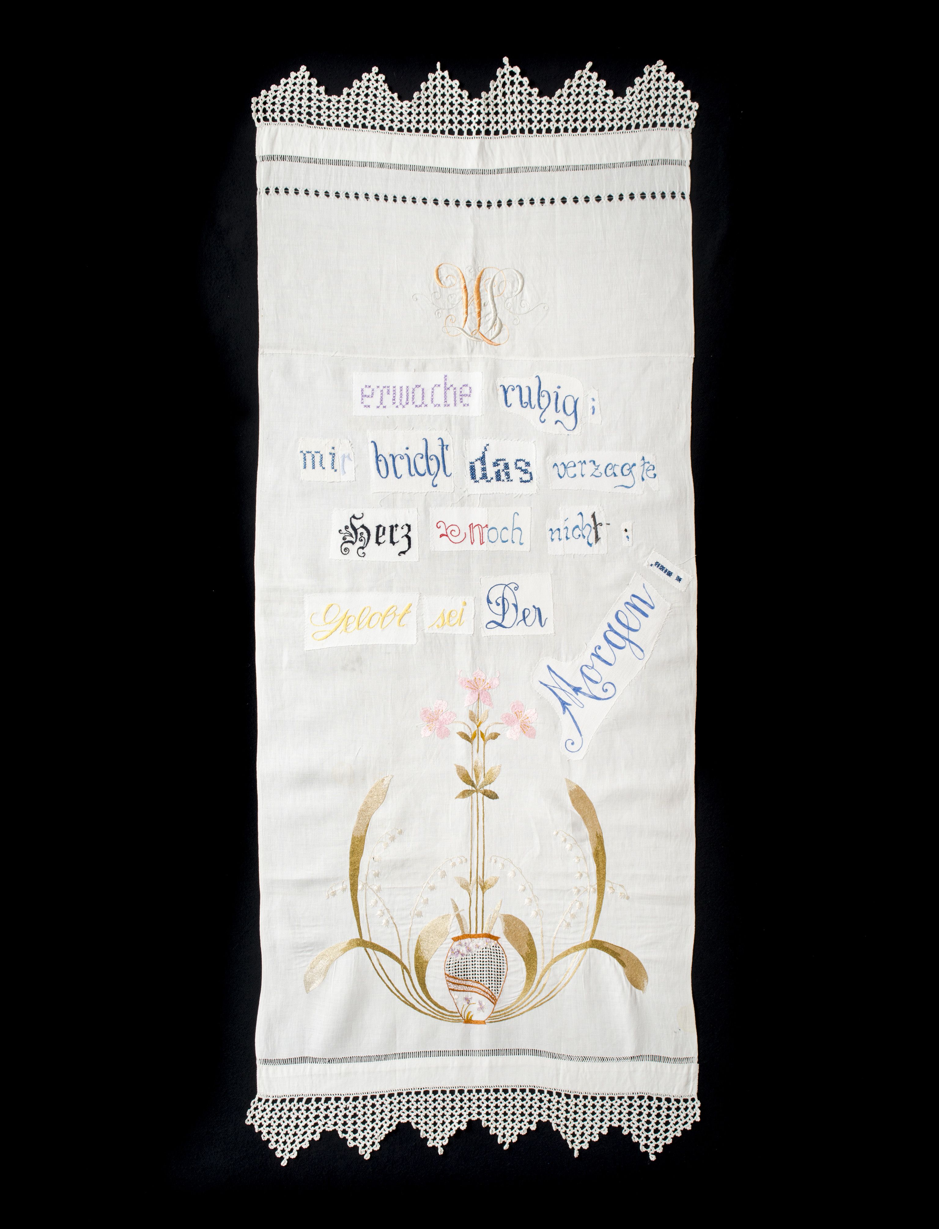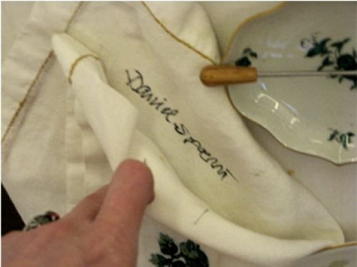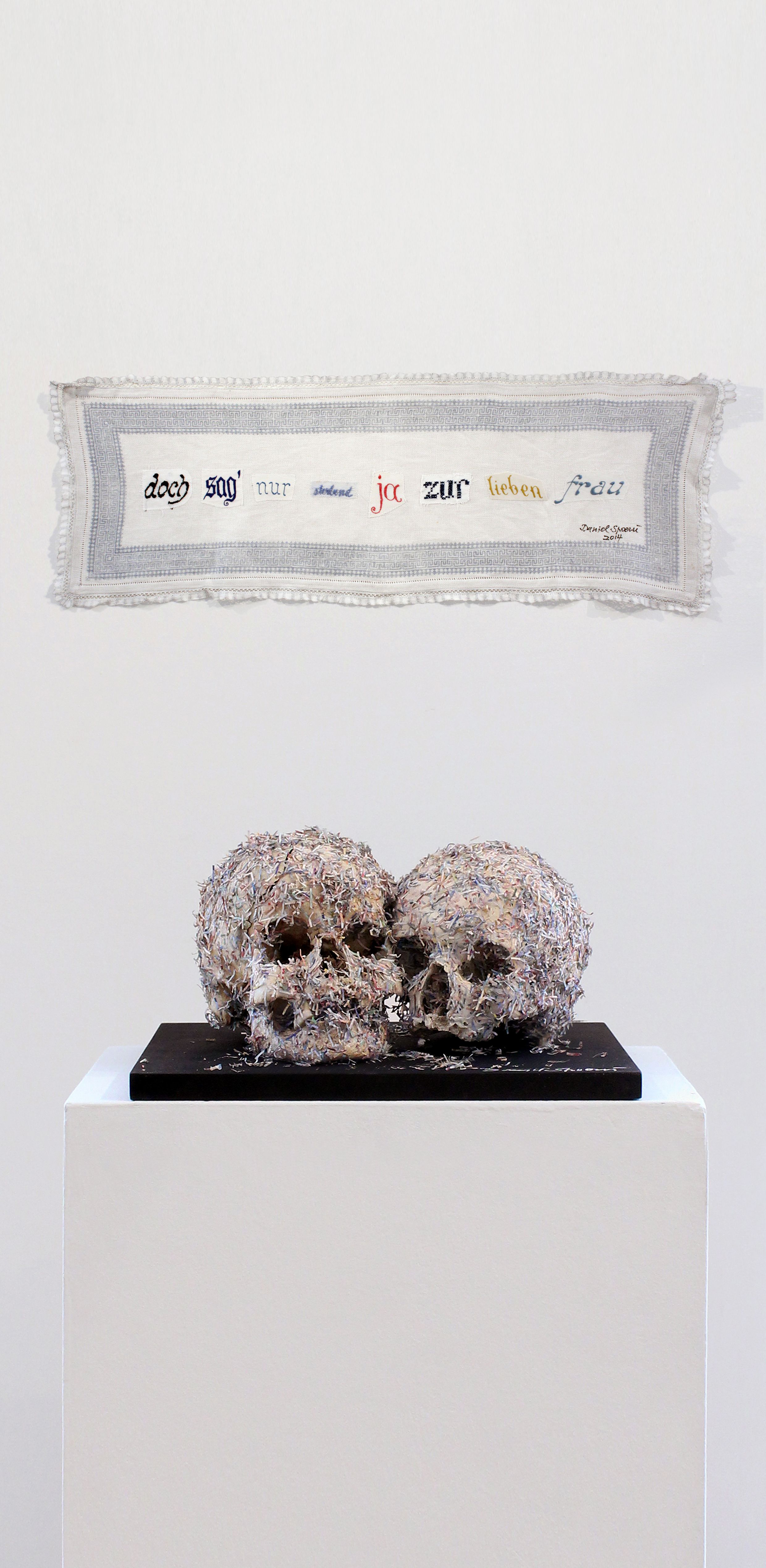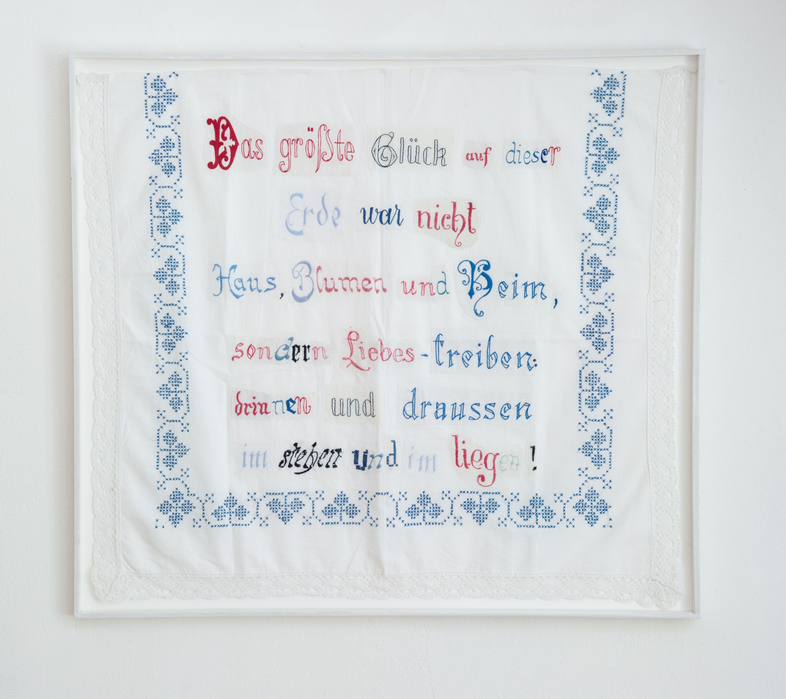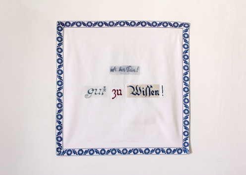 Daniel Spoerri lässt im persönlichen Umgang sehr oft eine fast schon spitzbübische Keckheit durchblitzen. Mit feinem, hintergründigem Witz kommentiert er dann zumeist ganz nebenbei Aussagen oder Situationen. Diesen feinen Witz hat er in seinen Spruchtüchern festgehalten – Kleinodien, zusammengefügt aus Buchstaben und Wörtern von auf dem Flohmarkt gefundenen, mittlerweile aus der Mode gekommenen Tüchern mit gestickten Sinnsprüchen, die früher hinter Sofas zum Schutz der Wand aufgehängt waren.